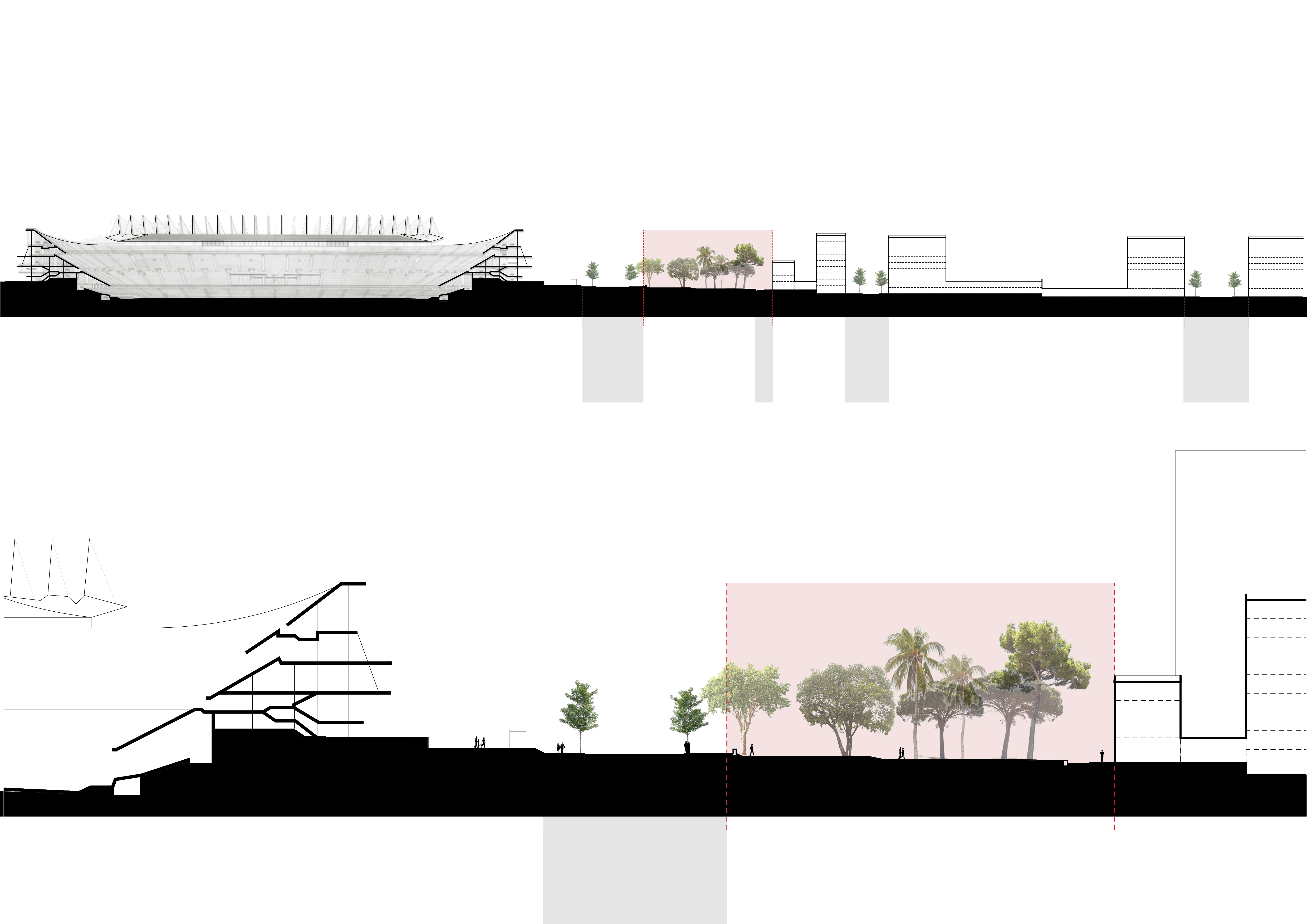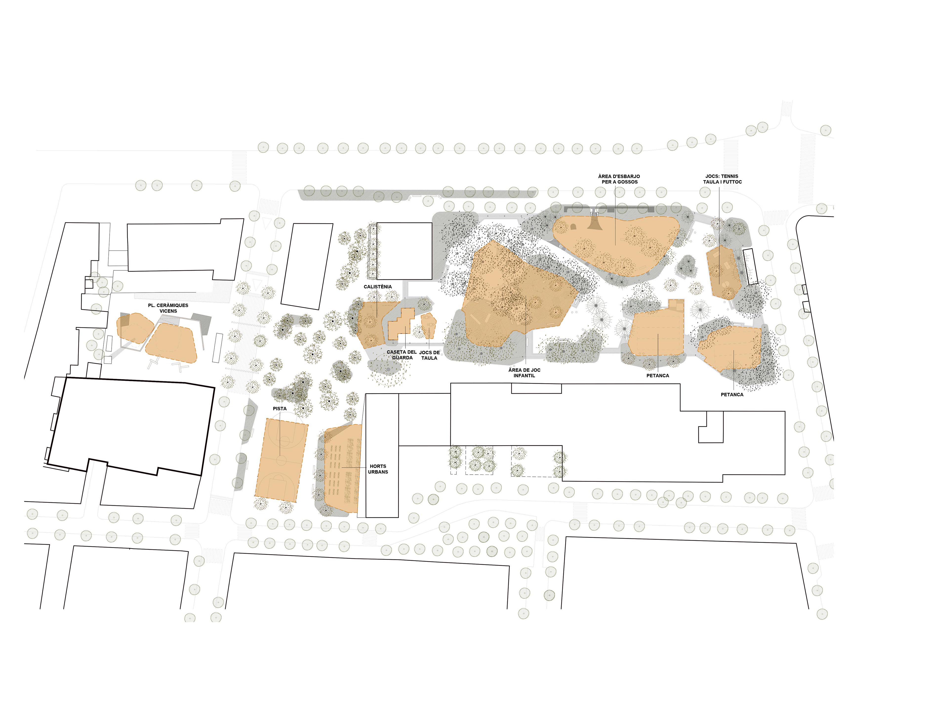 The formalisation of this idea is centred on the perimeters of these pockets of use, which are connected to each other and connect the whole area from east to west, acquiring different functions depending on the needs: landscaped spaces, changes of paving, living spaces and enclosures.