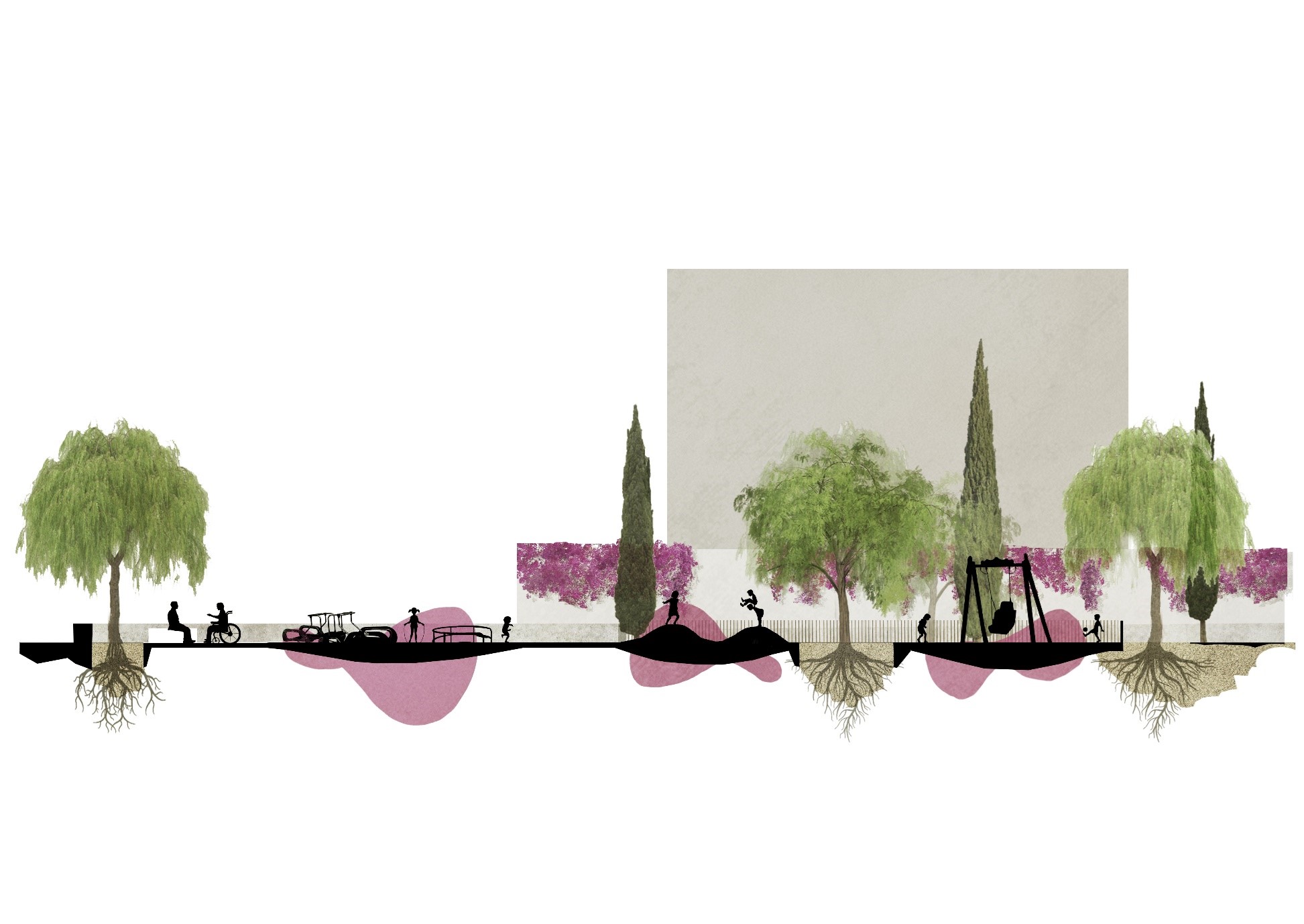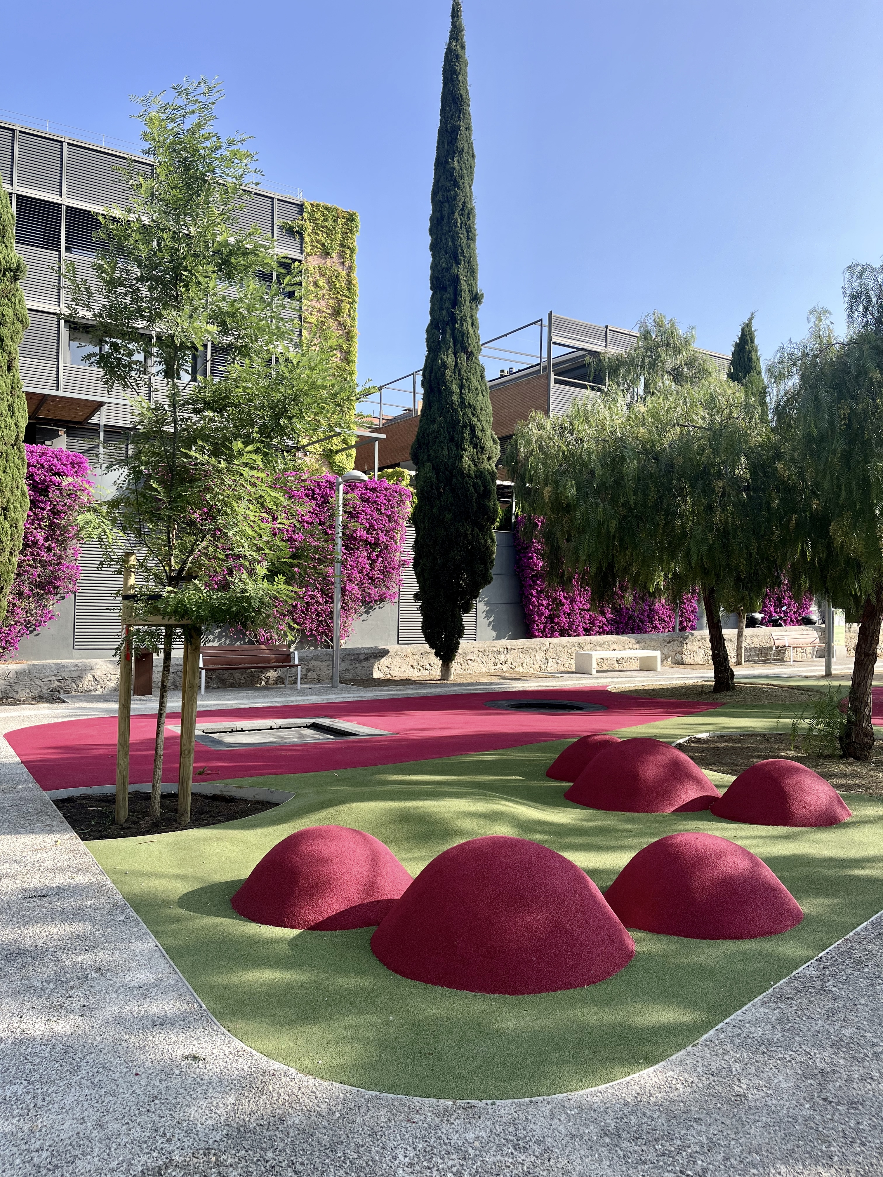 The rubber pavement, used to ensure accessibility in the play area, inevitably involves the application of color over a significant portion of the surface. A specific color contrast is incorporated, designed to be perceptible to users with visual functional diversity, in order to clearly define the safety zones. In this context, the project develops a visual narrative that links the three dynamic play sub-areas with the three petals of the bougainvillea flower, a species commonly found in the area.