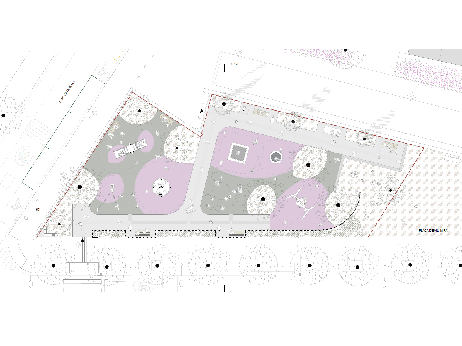 In this sense, a configuration is proposed that guarantees an accessible route in the play area while respecting the alignments of the square and the preferential circulations. As a result of this initial decision and the desire to integrate the pre-existing trees into the space, 4 sub-areas of play have been created: 3 dynamic play areas and 1 quiet play area.