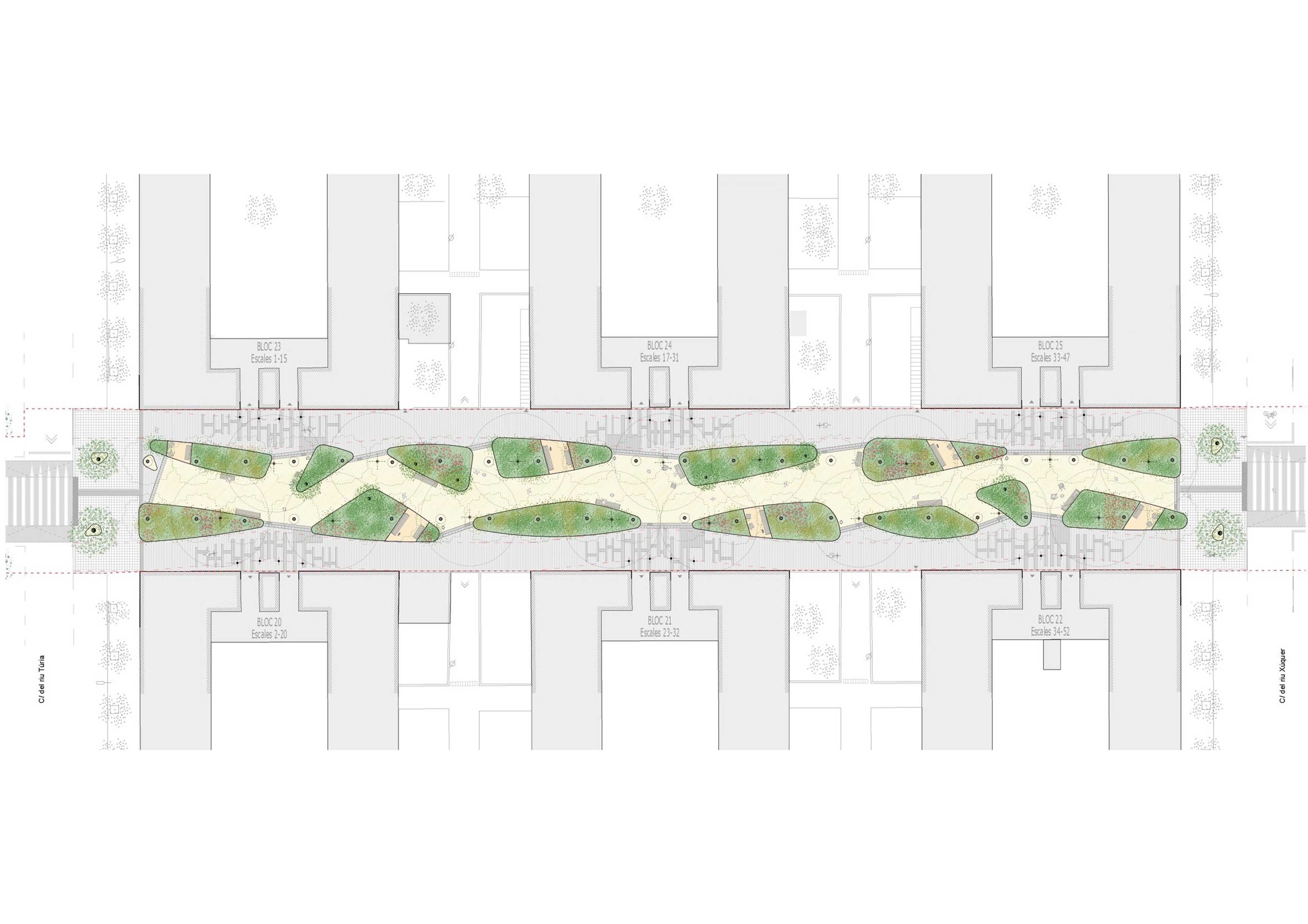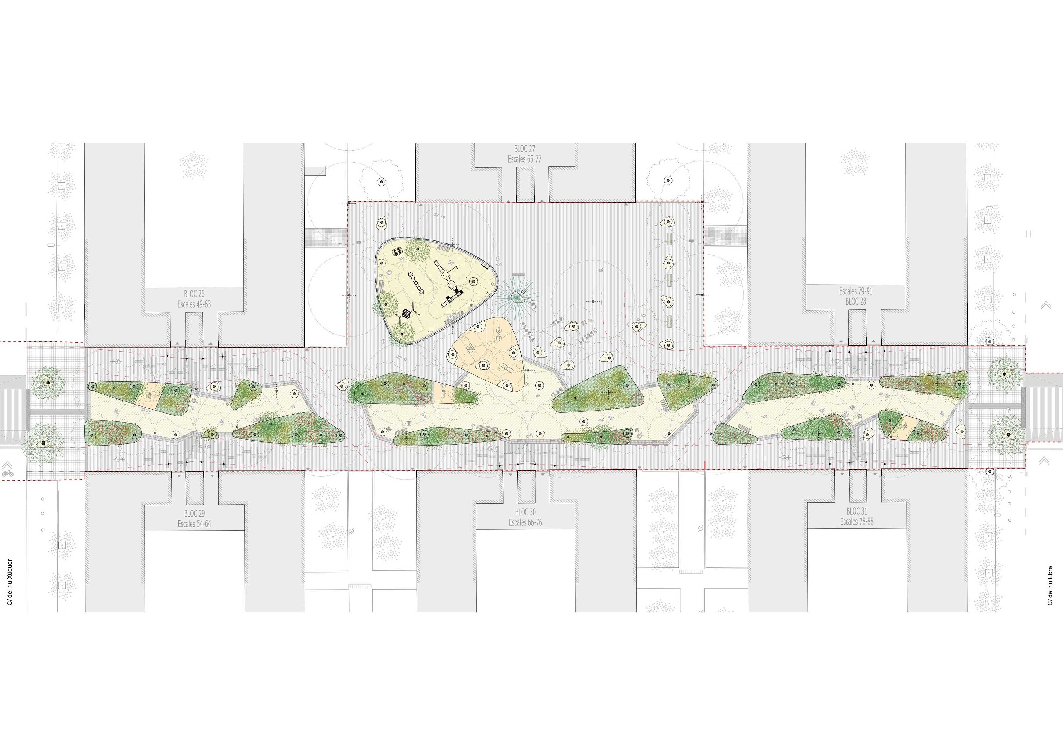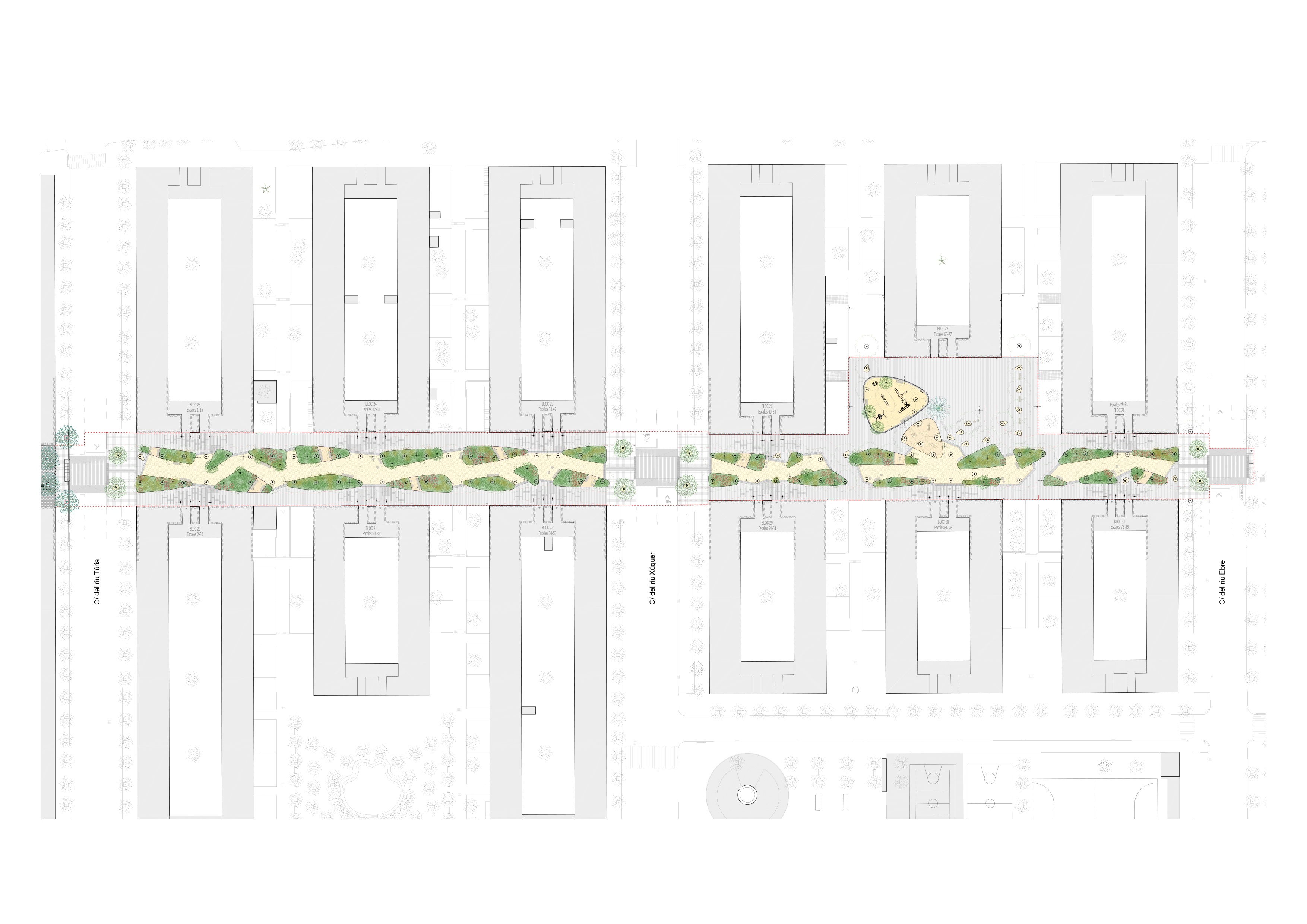The new section is characterized by incorporating garden areas related to the existing trees, combined with resting spaces and recreational-sports activities. The central area is differentiated from the sides, with the former paved with sand, promoting better management of runoff and an increase in permeability compared to the pre-existing situation.