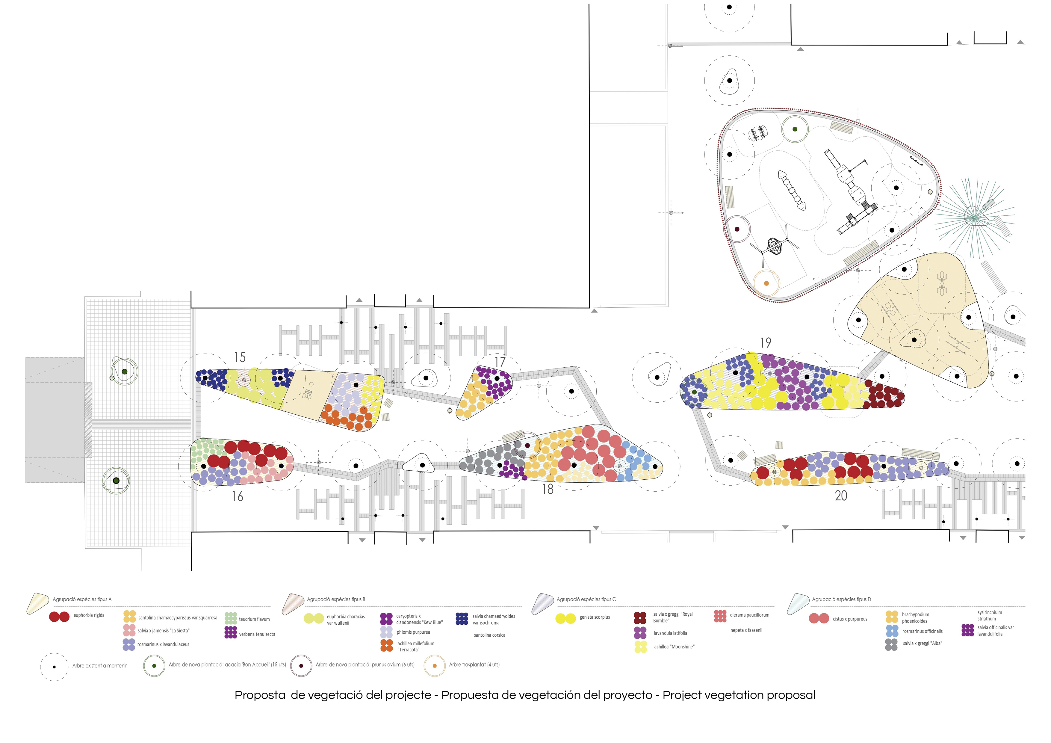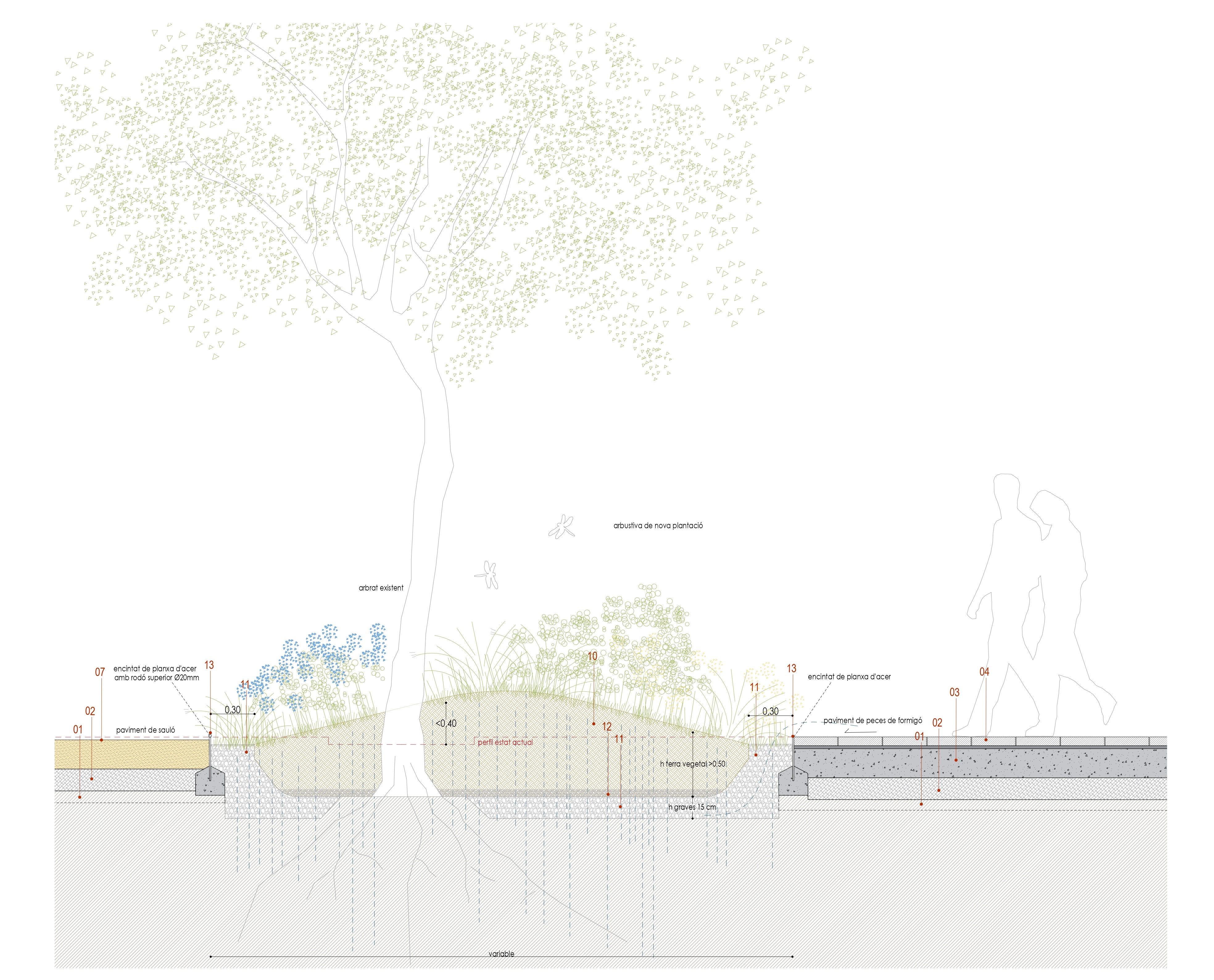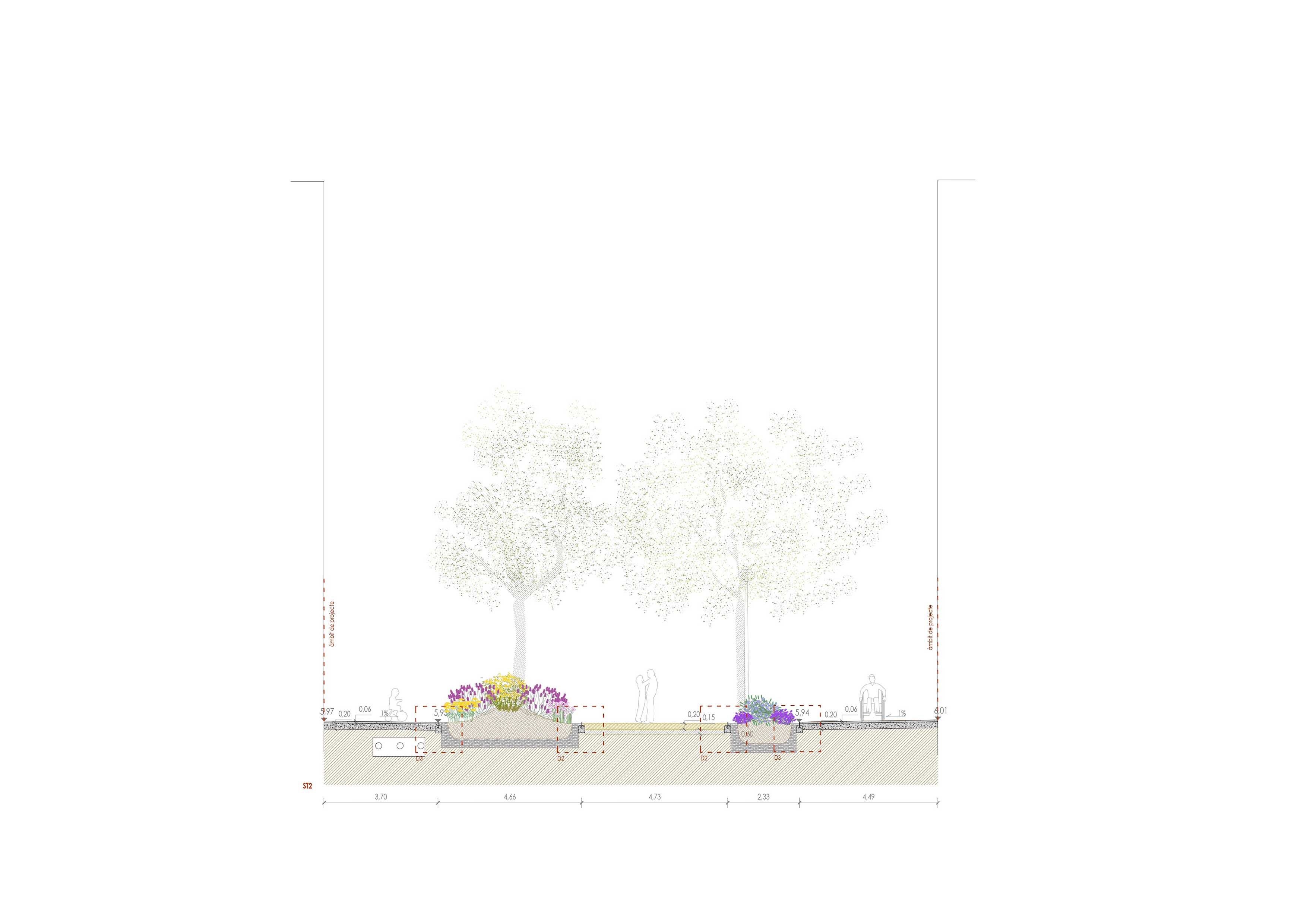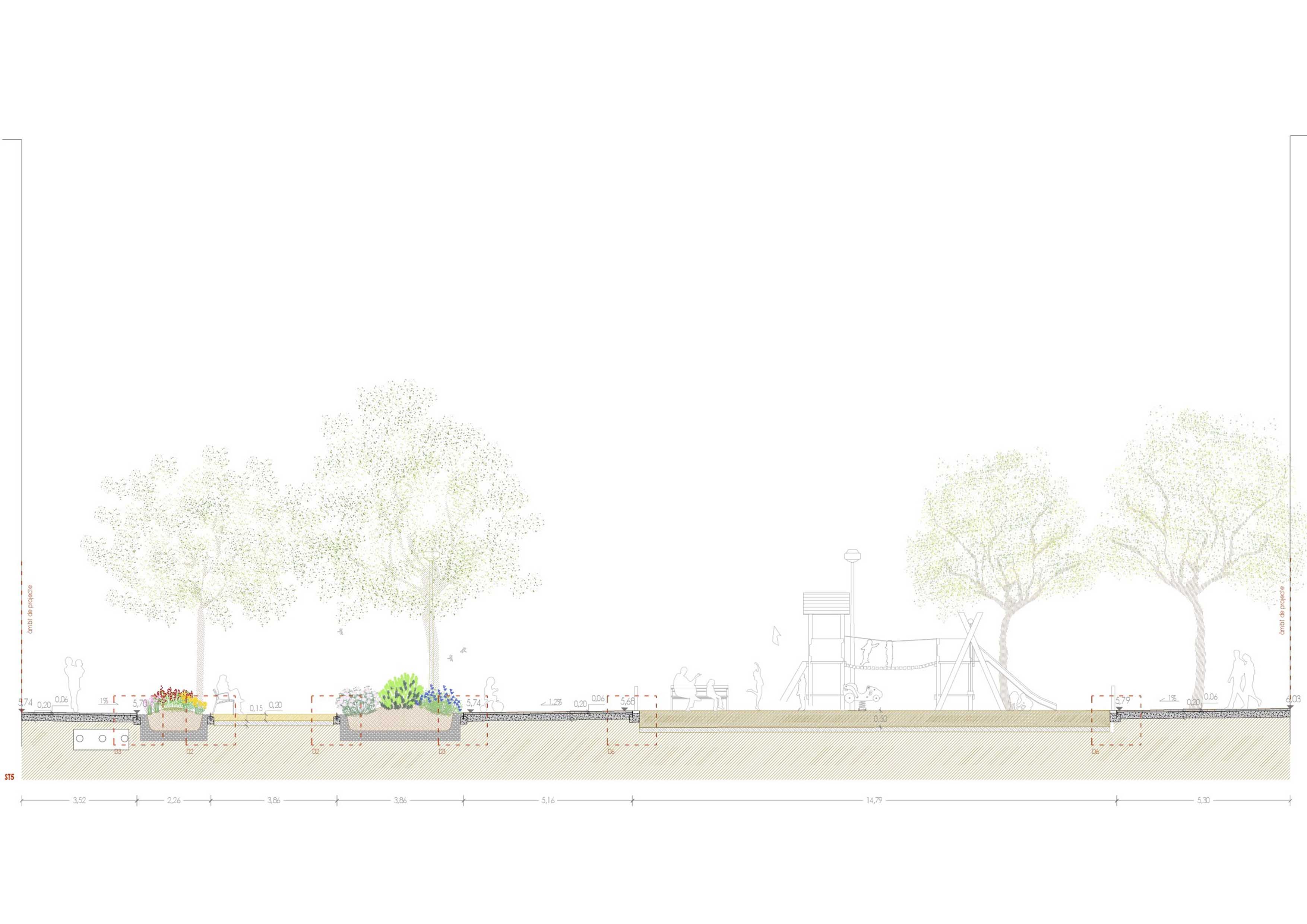 The new section is characterized by incorporating garden areas related to the existing trees, combined with resting spaces and recreational-sports activities. The central area is differentiated from the sides, with the former paved with sand, promoting better management of runoff and an increase in permeability compared to the pre-existing situation.
