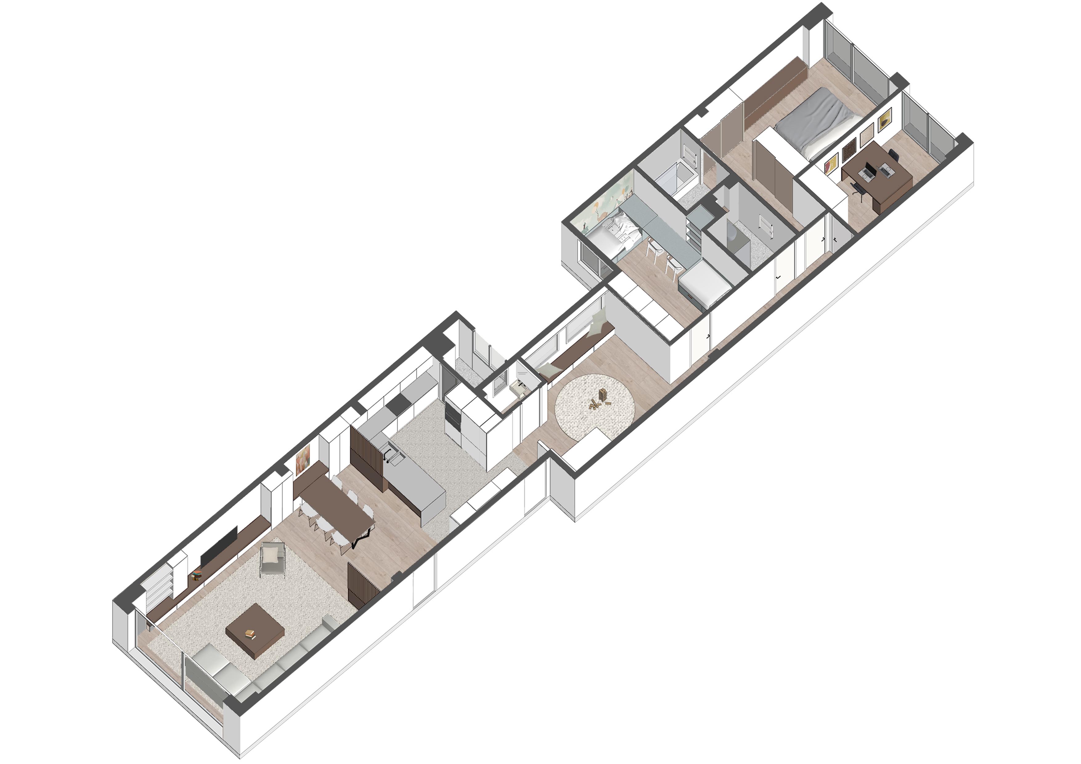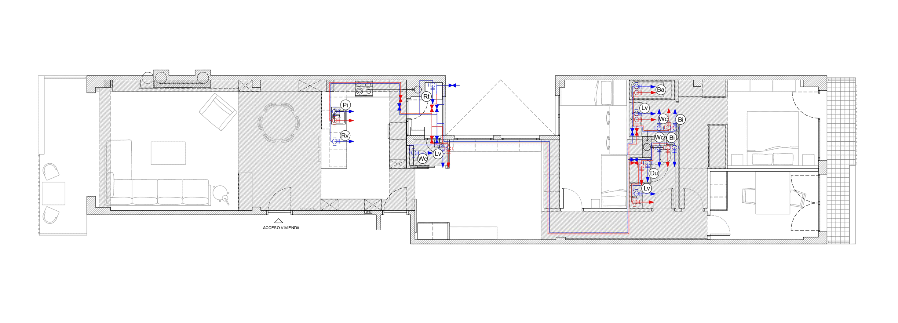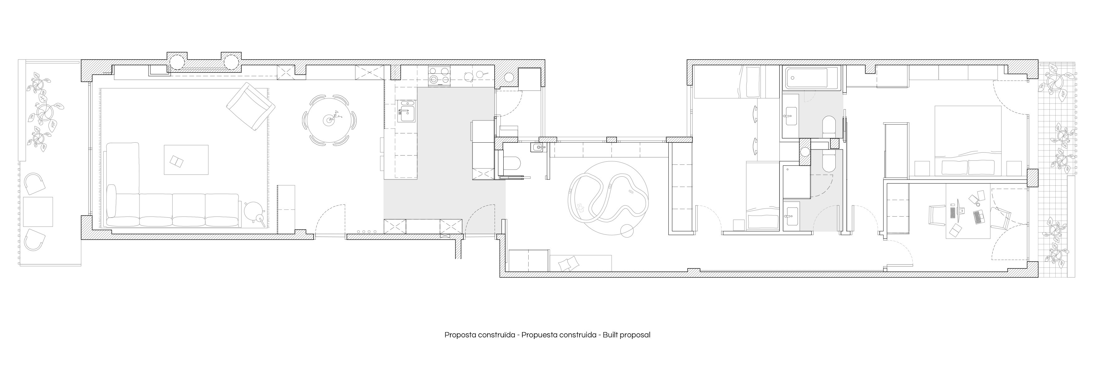 The project proposes a clear distribution where two areas are differentiated, one corresponding to the common uses and the other to the bedrooms.