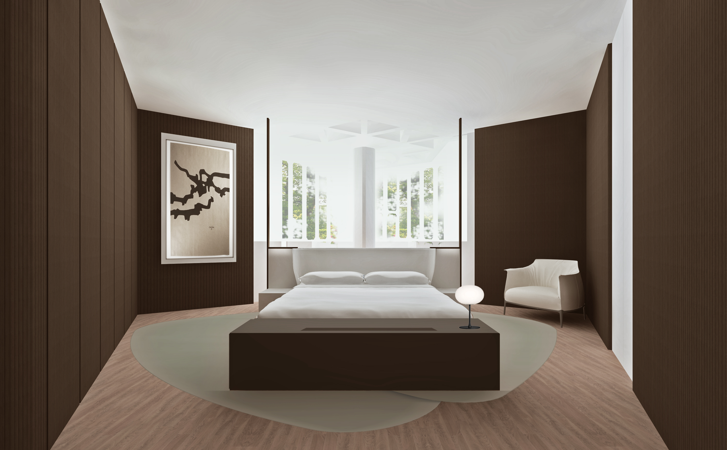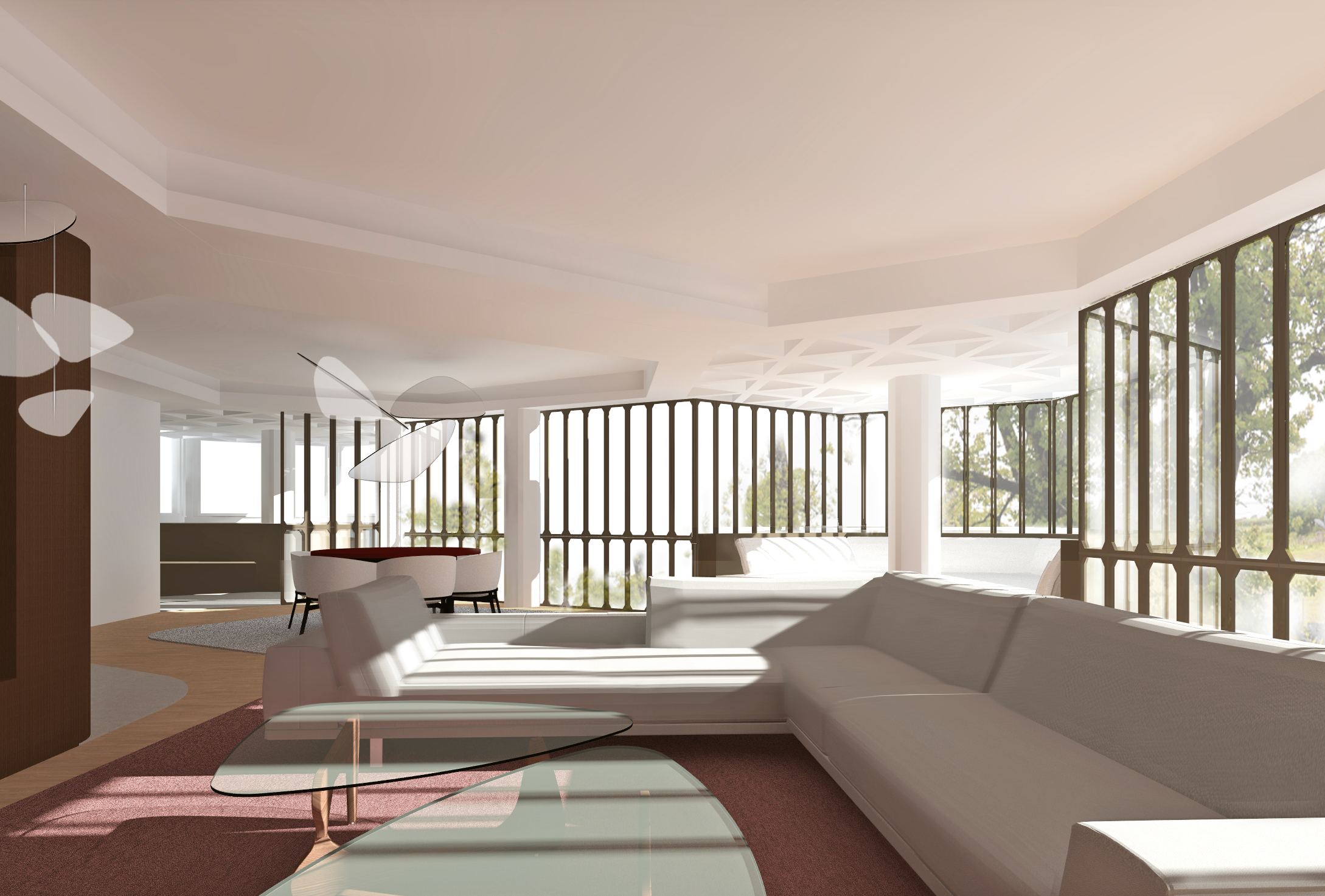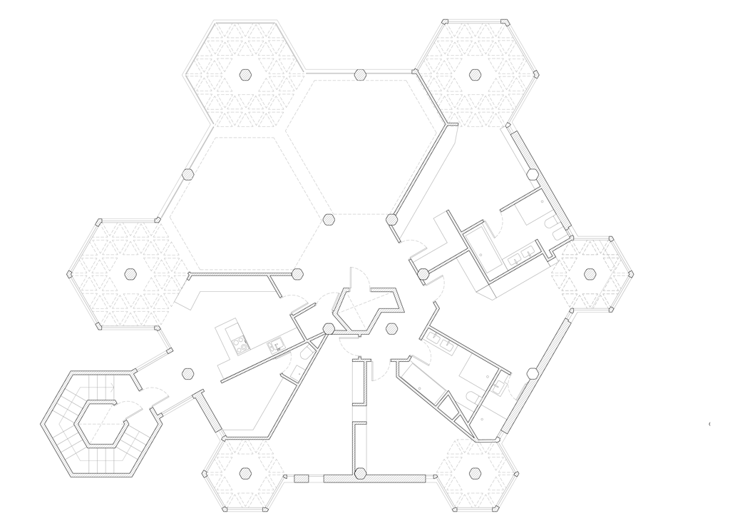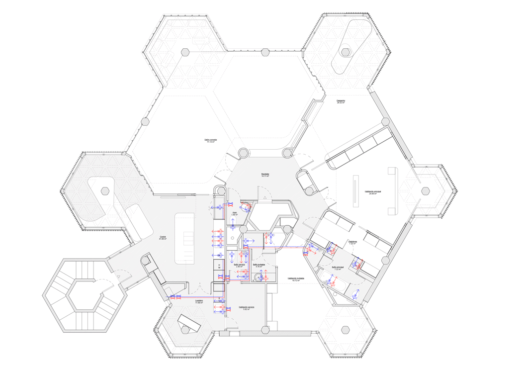 The particularity of the project lies in the configuration of the building in which the dwelling is located. It is a hexagonal building with central access via a lift, with only one dwelling per floor of approximately 280 m2. At each of the vertices of the general hexagon that forms the footprint of the building, smaller hexagons are attached where the triangular waffle slab is identified, defining the common layout of the floor plan.