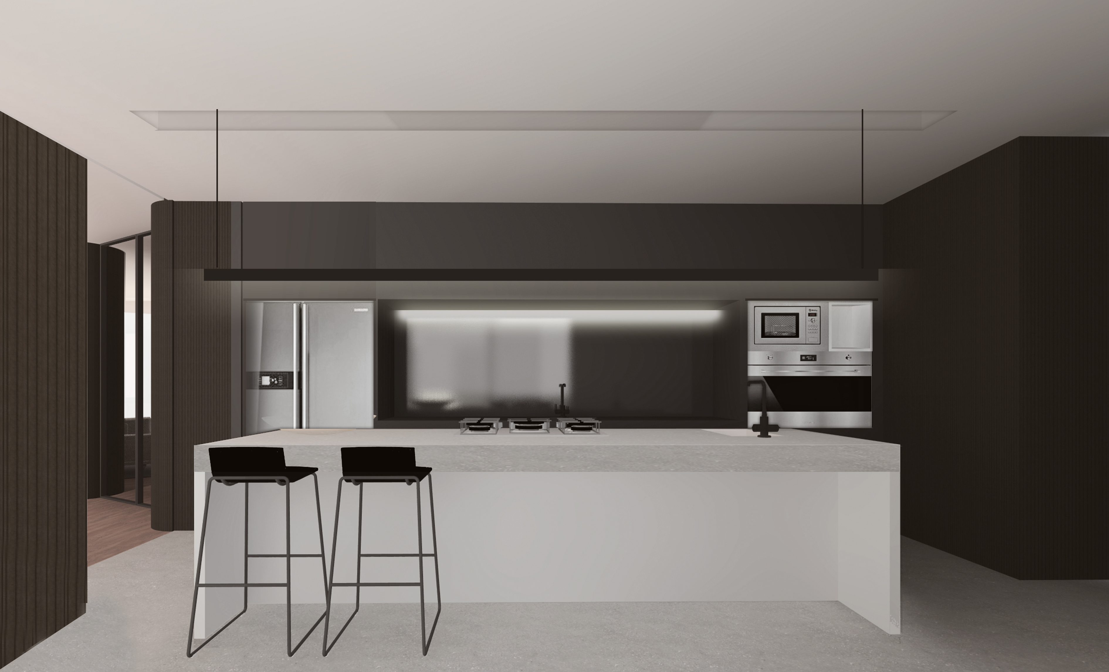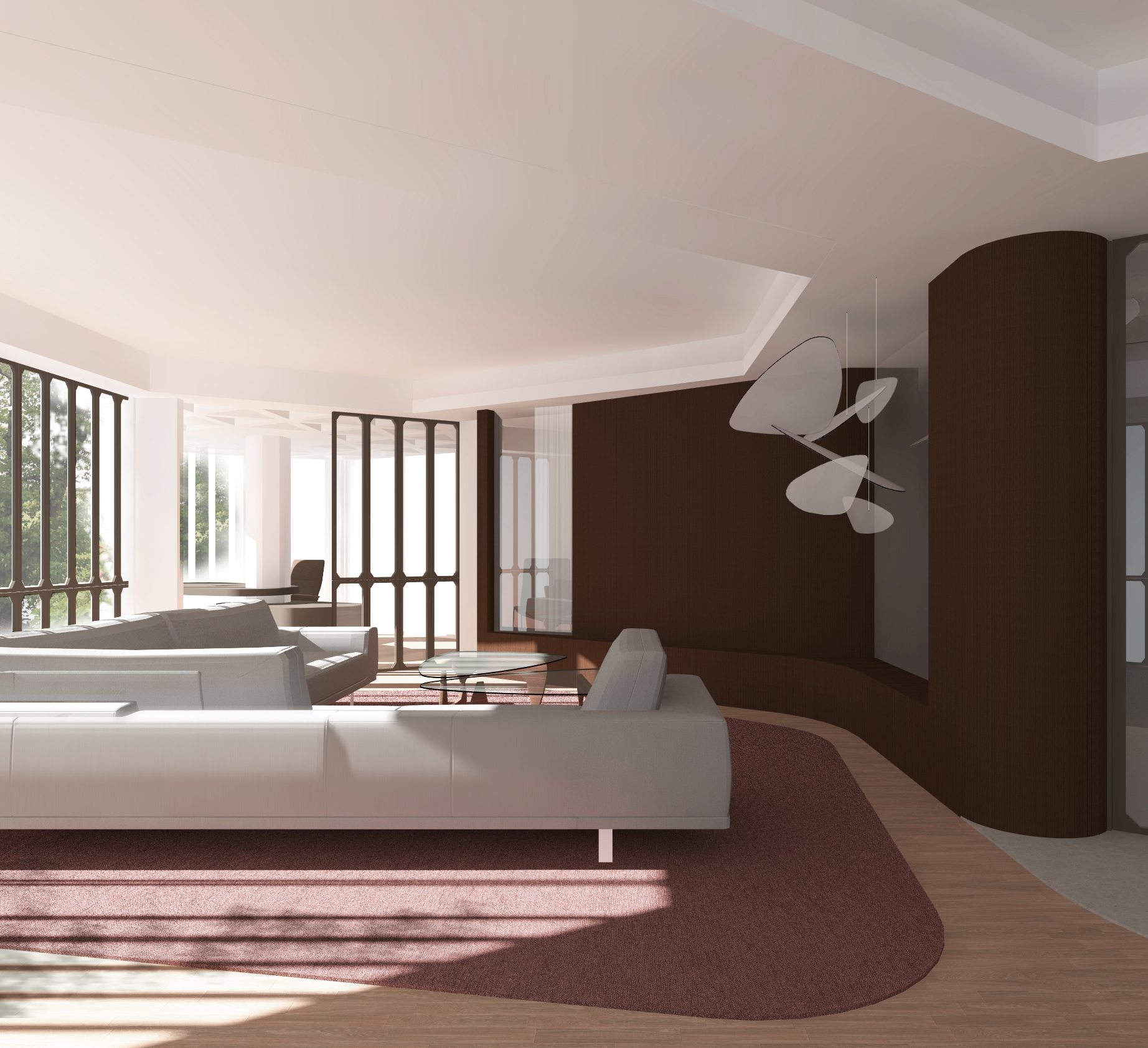 The interior partitions are materialised with vertically cut, dark-coloured finishes, reinforcing the curved geometries and contrasting with the luminosity of the perimeter. The installations are organised through a radial layout and are routed through the false ceiling, minimising its occupation in order to maintain the maximum free height and leave the triangular framework of the forging visible in the cantilevered volumes of the vertices.